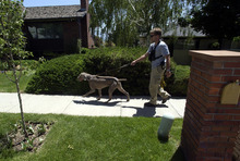 Search dogs work through the Salt Lake City neighborhood of 14-year-old Elizabeth Smart, who was kidnapped from her home early June 5, 2002.