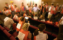 Volunteers are briefed in the auditorium of Shriner's Hospital in Salt Lake City prior to