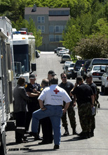 Salt Lake City authorities gather at the command center near the Salt Lake City home of 14-year-old Elizabeth Smart, who was kidnapped early June 5, 2002. The home is located near 1500 East and 300 North. The home that can be seen in the background is not the Smart home.
