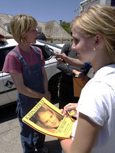 Diane Langeland (left) and her 16-year-old daughter Kate Langeland prepare to pass out fliers containing information on Elizabeth Smart, who was kidnapped from her Salt Lake City home early June 5, 2002. The Langelands, along with other members of the LDS ward that Smart attended, printed the fliers and passed them out to area businesses.
