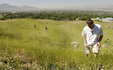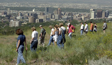 With Salt Lake City's downtown in the background, volunteers search the foothills below t