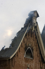 About 25 firefighters poured water on the flames from outside throughout the early morning. The roof began collapsing around 5 a.m., and fell in completely an hour later, pulling down part of the front parapet and wall. Water from the firehoses glazed nearby trees in ice.