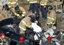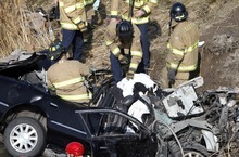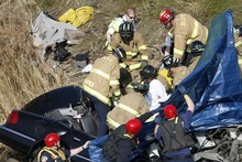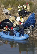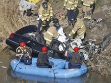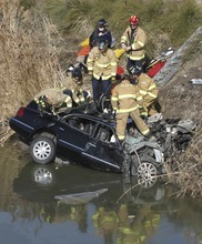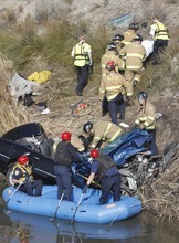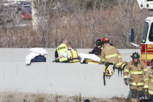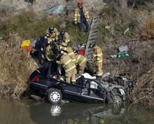 Firefighters work Friday to remove the body of the driver of a car that flew over the pond from the off ramp from I-15 to 2100 South and smashed into a dirt embankment. The driver was identified as 21-year-old Maria L. Mejia.