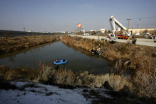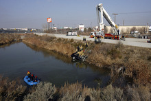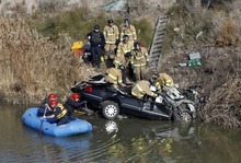 Firefighters work Friday to remove the body of the driver of a car that flew over the pond from the off ramp from I-15 to 2100 South and smashed into a dirt embankment. The driver was identified as 21-year-old Maria L. Mejia. Police aren't sure when the accident happened and have no witnesses.