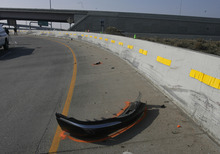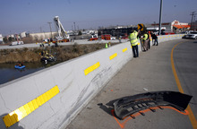 Debris sit on the road as firefighters work to remove the body of the driver of a car that flew over the pond from the off ramp from I-15 to 2100 South and smashed into the embankment on the other side.