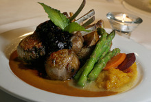 What the kitchen may lack in diversity, it makes up for it in protein execution. Tender beef tenderloin ($30) was topped with a slice of umami-laden blue cheese and a drizzle of port-demi glace. A roasted airline breast of chicken, that's with the first joint of the wing attached ($21), had crispy skin and moist meat, while six rosy lamb ribs ($31) were artfully arranged along with a smattering of blueberry-mint chutney. The only misstep came with a double-cut pork chop ($23), which needed less cooking to retain its moistness.