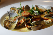 One can choose from four appetizers or three salads to start, including three well-seared scallops ($14) nestled in chipotle cream sauce, braised pork belly ($12) with unusually good jalapeño grits hidden by a pool of roasted garlic demi glace and steamed clams ($11) with bits of sausage in a salty herbed white wine sauce.