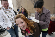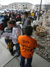 Also near the front were Bob Kelly and his son, Josh, of West Jordan. They said they had been practicing with the Wii game system's version of "Minute to Win It."