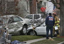 "It sounded like a bomb at first," said Doug Tollstrup, who lives across the street. I thought, 'What in the hell is that?' I looked out there and that car is sitting clear up there, almost on the porch. And I saw the driver crawling out of the window of the car."