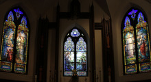 Three panels tell the story of Christ's Anunciation, Resurrection and Journey on the Road to Emmaus at St. Mark's Episcopal Cathedral, 231 E. 100 South.