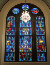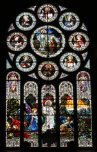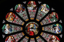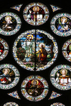 "Resurrection of Christ" in east transept of Cathedral of the Madeleine, 331 East South Temple. The upper section of the window features, in the center, Mary Magdalene greeting the resurrected Christ at the tomb. Images of saints on outer edge of window: left to right, beginning at top center: St. Francis de Sales, St. Agnes, St. Stephen, St. Ignatius of Loyola, St. Francis of Assisi, St. Bernard, St. Vincent de Paul, St. Monica (mother of St. Augustine).