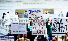 They chanted, "Veto! Veto!" and held signs reading, "Only a cockroach is afraid of light," "Sunshine, not secrecy" and "Hiding something?"