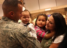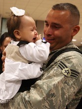 Cecilia Rea held her baby in her arms and bounced gently up and down on the balls of her feet. The tiny girl cooed softly. Next to Rea's hip, her 7-year-old daughter, Heather, rolled and unrolled a sign she had made for her father, Senior Airman Geiber Rea, who was just minutes from returning to his family after a six-month deployment to Afghanistan.