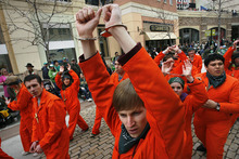 The "band" consisted of a group of volunteers in handcuffs, dressed in bright orange prison jumpsuits playing kazoos.