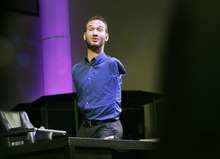 Vujicic, born without limbs, deftly maneuvered his automated wheelchair through a narrow stretch between the choir riser and the stage's edge to the desk that would serve as his platform.