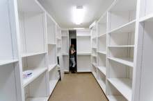 Brielle Decker opens up a hidden door leading to a secret chamber at the former home of Warren Jeffs in Hildale, Wednesday April 5, 2017.
