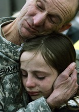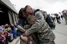 Amid the echoes of hundreds of raucous reunions inside a cavernous aircraft hangar, the music of an Army band and the sound of nearby jets taking off at Salt Lake City International Airport, the 1-year-old boy sucked on the end of a chocolate-chip cookie as he bounced gently in his father's arms. It was a much smoother reunion than when Mitchell Vreeland came home for two weeks on leave, midway through his tour of duty.
