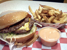 Ab's Drive-In • Sometimes the meat gets lost in all those toppings and condiments, but that's not the case with the "Fat Boy" ($3.29). Two 1/8-pound top-and-bottom patties are complemented by cheese, tomatoes, shredded lettuce, mayonnaise and a not-so-secret pickle relish-tomato mixture. The tang takes you by surprise but keeps you thinking about this burger long after your initial craving has abated. 4591 S. 5600 West, West Valley City; 801-968-2130 and 7903 W. Airport Road, West Jordan; 801-280-8075. More information at http://www.absdrivein.com. Open daily, 10:30 a.m. to 10 p.m. Lesli J. Neilson