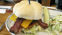 Lucky 13 • The bacon cheeseburger, $7.50, is a winner for anyone with a hankering for a really big burger. It's messy-beyond-belief, but that's easy to overlook when you bite into the beefy, charbroiled patty topped with cheddar and heavenly house-smoked apple-wood bacon. This is bar food at its best. 135 W. 1300 South, Salt Lake City; 801-487-4418. Open Monday to Saturday, 11 a.m. to 2 a.m.; Sunday, 10 a.m. to 2 a.m.