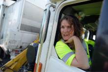 Customers like her, too. Kitchen sometimes lets little kids toot the horn on her truck, getting cookies in return on occasion. She also gets compliments along her route from old men impressed to see a "girl garbage guy" at the controls.