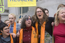 Joan Gregory, 58, a conservation organizer at the Salt Lake City church, said she felt compelled to act on behalf of younger generations. Her sit-in group sang "We Shall Overcome" before the arrests, she said, and later sang many songs during several hours in jail. She faces a misdemeanor unlawful-entry charge and must return to appear in a Washington court May 10.