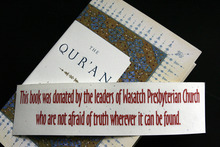 The leaders put up $600 before the meeting was over and ordered dozens of copies of an Oxford Press edition of the Quran several days ago. The books will be available as early as Monday at King's English Bookshop, each with a bookmark bearing these words: "This book was donated by the leaders of Wasatch Presbyterian Church, who are not afraid of truth wherever it can be found."