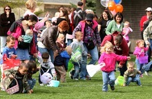 Children had a chance to visit with the Easter bunny at Murray's Southwood Park, before heading off to hunt plastic eggs filled with small toys. The event was completely free of food, allowing children like 3-year-old Caden Scherbel to hunt without the fear of parents taking away treats. Caden is allergic to all food, explained his mother Tiffany Scherbel, and must receive all of his nutrients through a feeding tube.