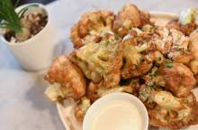 Stuffed grape leaves (three for $6) were tender and tart, bursting with seasoned rice, tomatoes and the surprising crunch of walnuts. We also loved the kibbeh balls ($7 for two), which are generously sized, fried ovals of ground beef mixed with bulgur and walnuts. They come with the same tangy tahini sauce as the cauliflower as well as a few chopped tomatoes and pickles.