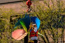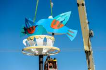 Willie Gomez installs Traci Oívery Covey's piece "Drinking it In" onto its perch