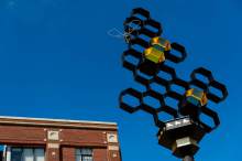Willie Gomez installs Traci Oívery Covey's piece "Drinking it In" onto its perch on 300 South and 300 East in Salt Lake City on Saturday. The Salt Lake City Public Art Program spent the day installing the permanent Flying Objects public art sculpture series. The previous rotation of Flying Objects, now removed, was installed in 2014 and the sculptures are currently for sale through the artists.