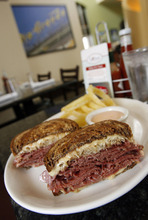 The same thinly sliced corned beef showed up in the corned beef Reuben ($9.95), recommended by our server as a house special. The succulent beef was bolstered by Jarlsberg cheese, sauerkraut and Thousand Island dressing. The result was a gooey, messy treat. We also had to sample the pizza, given the restaurant's proud claims for its house-made dough and sauce. The vegetarian ($10.95, tomato, grilled eggplant, onion, green bell pepper, mushrooms and mozzarella) came with a thin and crispy crust, not to mention a simple but appetizing tomato sauce. The pizza was plenty for two to share, and one of 10 choices.
