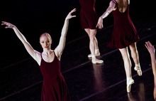 Emily Adams' "Regarding Us," for five couples, employs shifting patterns and symmetries in a way that references Balanchine, yet is fresh. David Huevel's purple and garnet costumes are eye-catching, though the men's half-sheer tops and bold-colored tights do them no favors.