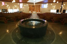 The church itself serves as an allegory for the Catholic pilgrimage through life, Carley explained. Starting at the main entrance, the faithful encounter the waters of baptism at a 7.5-ton black granite font. They proceed to the altar of brotherhood, where a skylight directs their gaze to heaven.