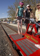 As an old fashioned hand-powered train cart glided across the center-street tracks simulating a future streetcar redevelopment agency vice chairman Carlton Christensen lauded the vision of Alfandre and Co.