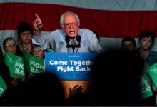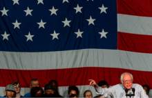 When he finished his speech, Sanders threw his fist into the air as he stood in front of a large American flag.