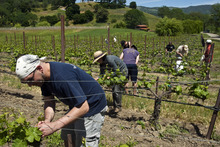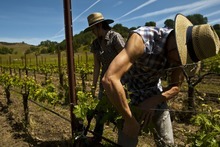 About a half mile away, in an area where Rousseau grapes are grown, the rest of the group thins vines, a process called "suckering." Removing excess or unhealthy looking leaves and stems opens up the canopy, allowing sun and air to circulate. It also prevents mildew and allows the plant to focus all its energy into producing luscious fruit, explains Alex MacGregor, Saracina's winemaker.