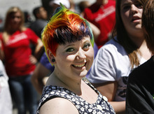 Thousands thronged the streets of downtown Salt Lake City on Sunday to watch the largest-ever Utah Pride Parade, an event that always guarantees some wild sights including men decked out in wigs, sequined dresses and high heels, and some clad only in hot pink underwear. There was even a mild-mannered male pit bull dressed in a tutu and rainbow-colored leis.