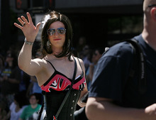 Salt Lake City Mayor Ralph Becker and Salt Lake County Mayor Peter Corroon were among several elected officeholders with parade entries. And in a robust show of support, scores of red-shirted volunteers marched behind Wells Fargo's float, which bore the message "Take pride in a bank that takes pride in you."