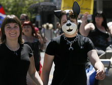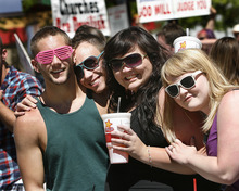 Temple Square, an LGBT square-dance club, also had a lively but more traditional presence as they swung their partners down the parade route. The Salt Lake Men's Choir made melody as it walked behind a banner proclaiming, "Peace, love and harmony."