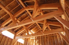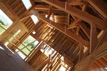 Great room with a two story ceiling, large beams and cables. Three transom windows line both