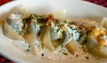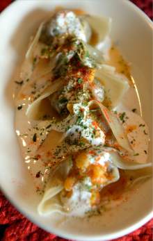 A dish of mantu ($3.50) started our lunch. The dumplinglike bites were filled with spiced ground beef and onions and topped with tomato sauce and a cool yogurt sauce. The dish is traditionally served lukewarm.