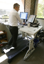 With his office space scheduled for refurbishment, he researched his options for working while standing. Now he walks while working at a TrekDesk, a molded plastic desktop that raises and lowers on metal legs which spans a small, ordinary treadmill he sets at 1 mph.