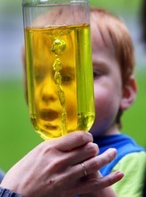 Adkinson explained an experiment, called the Cartesian diver, which uses a capped plastic bottle full of water. Inside, an eyedropper weighted with a nut floats at the top, but when the bottle is squeezed, pressure forces water up the dropper, causing it to sink.