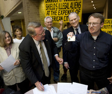 With the stroke of a pen, the stamp of a notary and the cheers of about 30 people looking on, Merrill Cook began a yearlong campaign to get on the ballot a petition that would require employers to use E-Verify while tacking on tough penalties for those hiring undocumented workers.