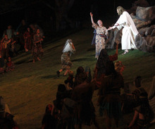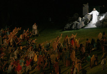 With his blond hair sprayed white and wearing a white-and-gold robe, Pipes climbed the temple's steep west tower stairs during a dress rehearsal. Then, at the appointed time, with a full moon and spotlights shining on him, he faced east, 169 feet above the ground and almost 210 feet above the valley floor.