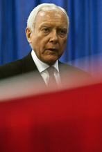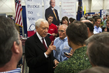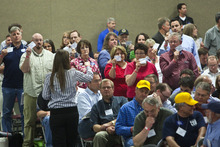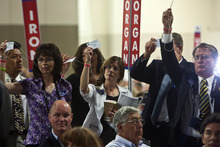 While the votes were being counted, Sens. Mike Lee and Orrin Hatch spoke to the somewhat distracted crowd that had slogged through the entire morning of parliamentary procedures in the South Towne Expo Center and the passage of the party's constitution and bylaws and anxiously awaited to hear the final vote.