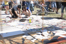 Chase Jensen, owner of Uprok and perhaps better known by his stage name, Street Jesus said DJs would be spinning throughout the weekend, and he even invited break dancers to come Saturday. Eating a bratwurst with sauerkraut and enough mustard to make French's jealous, Jensen was selling $5 cans of spray paint to anyone who wanted to contribute their own legal vandalism of a 48-foot-long, 8-foot-high plywood wall near the DJs. The sausage, he said, was to make sure he didn't get too intoxicated, since he'd been drinking since noon the previous day.