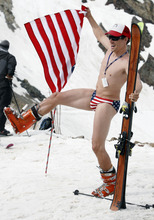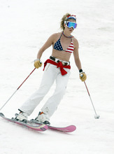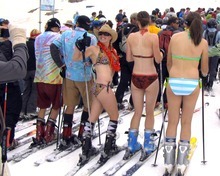Cat Killfoil of Park City received loud applause from the largely male line at Little Cloud lift when she skied up in a skimpy pink and purple bikini, pumping her ski poles into the air.