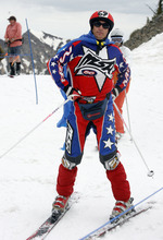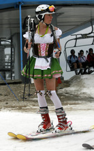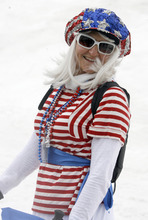 That's desire. That's freedom. And that's why Jane Rackl, 50, of Salt Lake City, shouted "because we can," when asked about skiing in a curious outfit that was part Hawaiian, part thrift shop. She then posed for pictures atop Hidden Peak with her friend, 35-year-old Rachel Collet, who was dressed like a Swiss yodeler and drinking a can of Pabst Blue Ribbon beer.