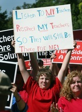 Fourteen-year-old Kyle Speckman worries he could lose some of his favorite teachers at Highland Junior High because of the contract dispute. He wore red to Thursday's protest to show solidarity with teachers, and raised a hand-written sign that read, "Listen to my teachers, respect my teachers, so they will still be there for me."